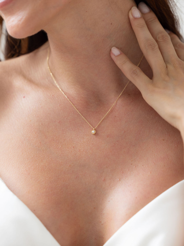 Collar de plata 925 chapado en oro con colgante redondo que enmarca una pequeña perla y circonitas. Se apoya suavemente en el centro del escote y aporta un acento fino y elegante. Longitud ajustable para combinar con otras joyas.