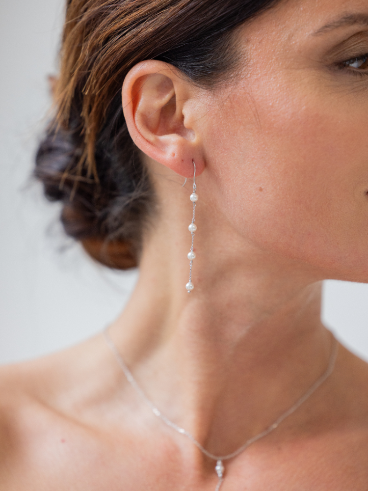 Pendientes largos de plata 925 con acabado plateado y cadena fina con cuatro perlas colgantes en línea recta. Su movimiento suave aporta un look delicado y romántico, perfecto para estilos nupciales clásicos.