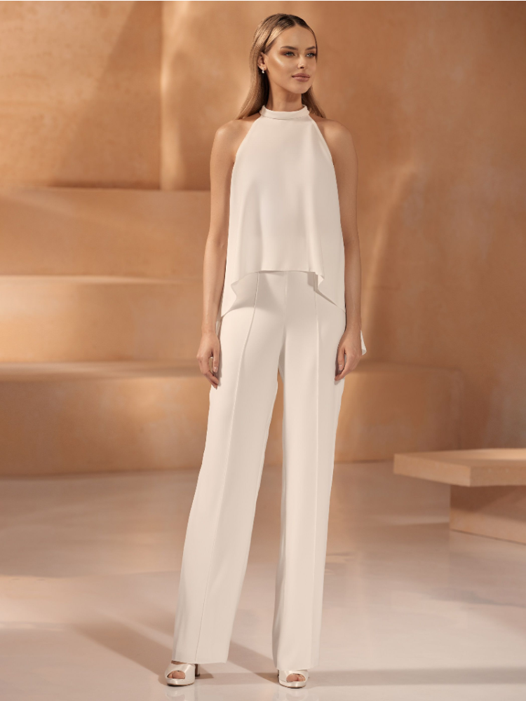 Este precioso bolero es perfecto para el día de tu boda. El top está confeccionado en crepé elástico y no tiene mangas. El bolero tiene un bonito escote redondo.
