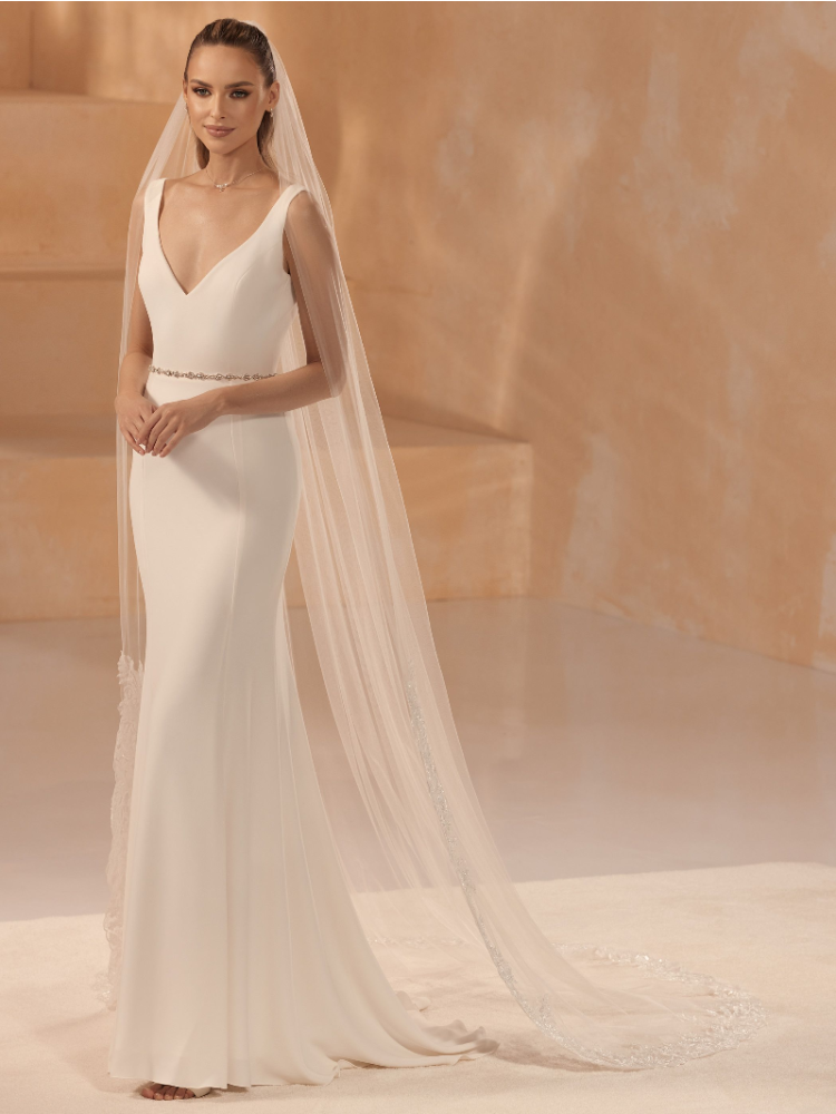 Este elegante velo de Bianco Evento completará tu look de novia. Este velo de una capa está hecho de suave tul con un borde cortado en la parte superior y un borde de encaje en la parte inferior. Lleva una peineta que facilita la colocación del velo en el pelo.