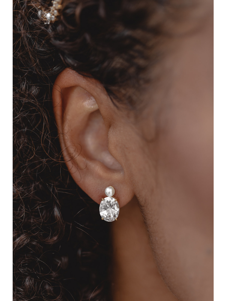 Nadie puede resistirse al encanto de esta exquisita joya: unos pendientes con una perla de agua dulce de gran tamaño y un gran cristal ovalado. El cristal refleja la luz maravillosamente con cada movimiento, haciendo brillar a quien lo lleva.