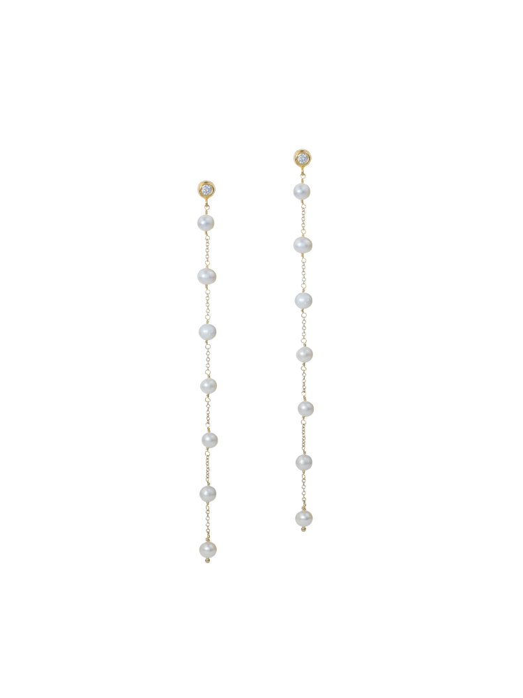 Es TU día, TU joya, y estos pendientes extravagantes y extralargos están diseñados para que tu boda sea inolvidable. Con un brillante tachón de cristal y siete perlas de agua dulce a cada lado, esta pieza contemporánea, a pesar de su diseño minimalista, seguirá elevando conjuntos como un pequeño vestido negro o un look de "vaqueros y blusa blanca" mucho después de la boda.