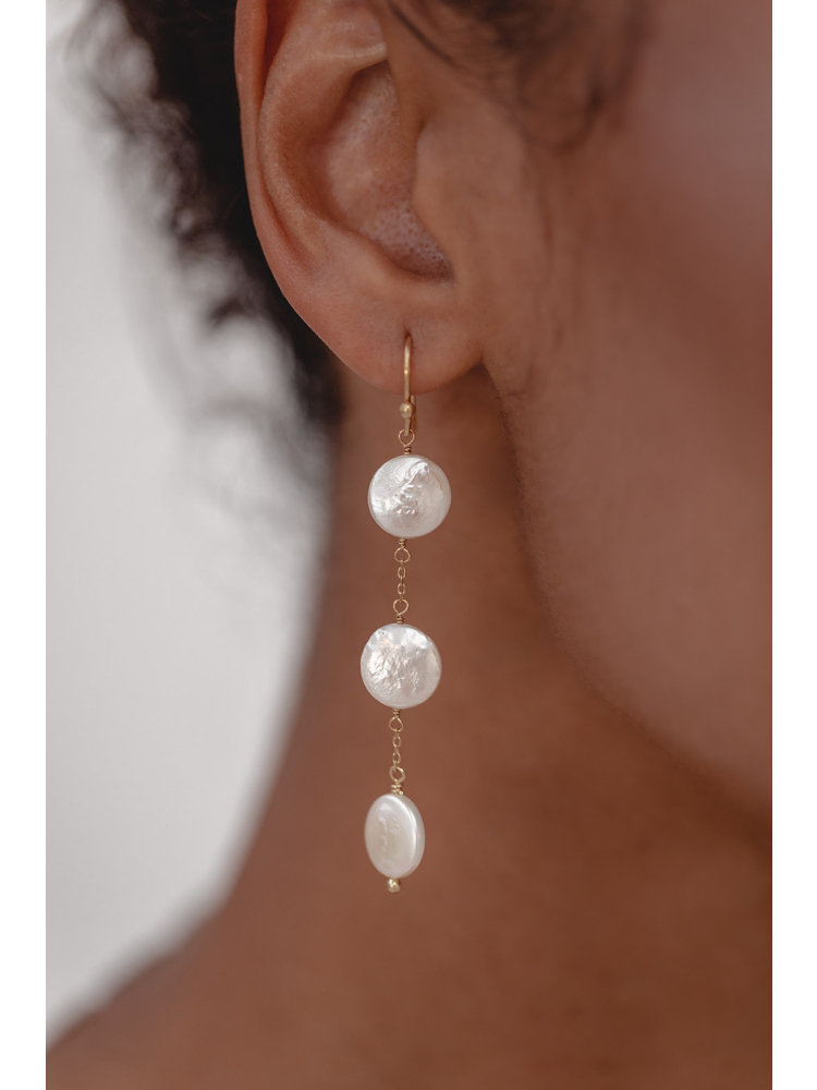 Estos largos pendientes colgantes presentan un moderno trío de cuentas en forma de "moneda". Las cuentas están unidas por delicadas cadenas, que aportan un movimiento extra y realzan cualquier conjunto nupcial.