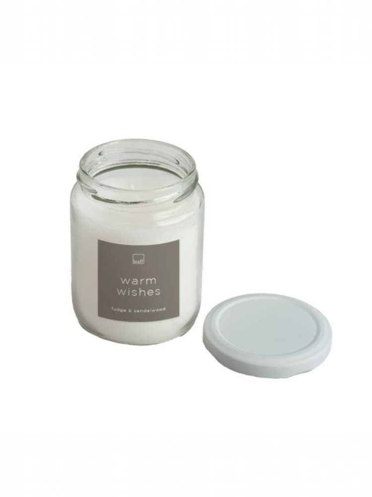 Descubre Leeff 18617 Vela en tarro L — «Warm wishes» en blanco, una vela de tarro elegante que aporta una luz suave y acogedora, con delicada fragancia fudge & sandalwood, ideal para los momentos de una boda.