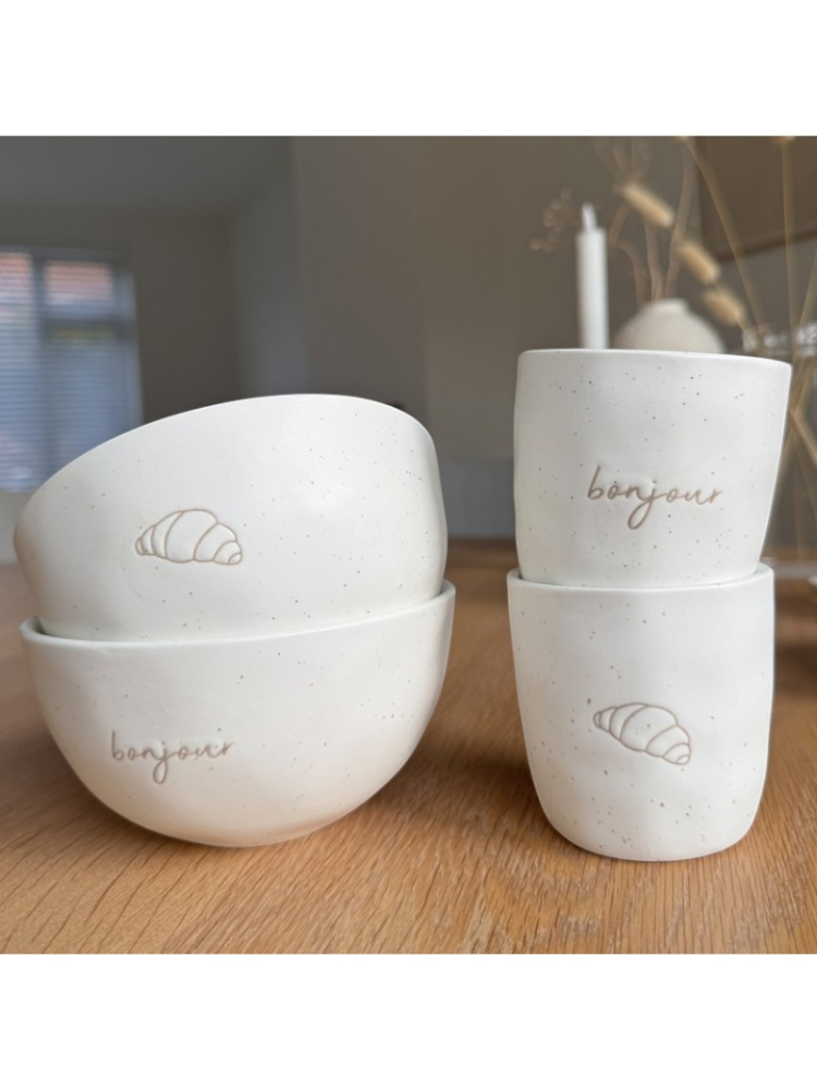 - Dos piezas coordinadas: un cuenco con ilustración de croissant y otro con el texto “Bonjour”.