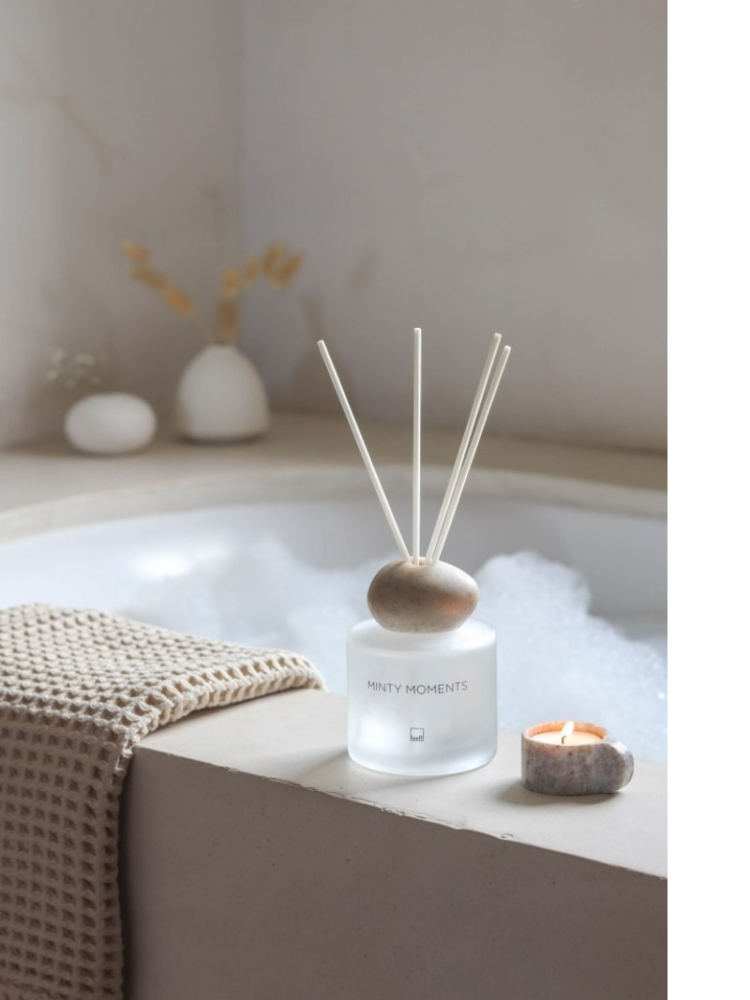 Un difusor elegante que envuelve el ambiente con una mezcla refrescante de eucalipto, lavanda y menta. Su tapa efecto piedra y la cita Vive el momento lo convierten en un detalle con encanto. Presentado en una bonita caja, perfecto para regalar y sorprender.
