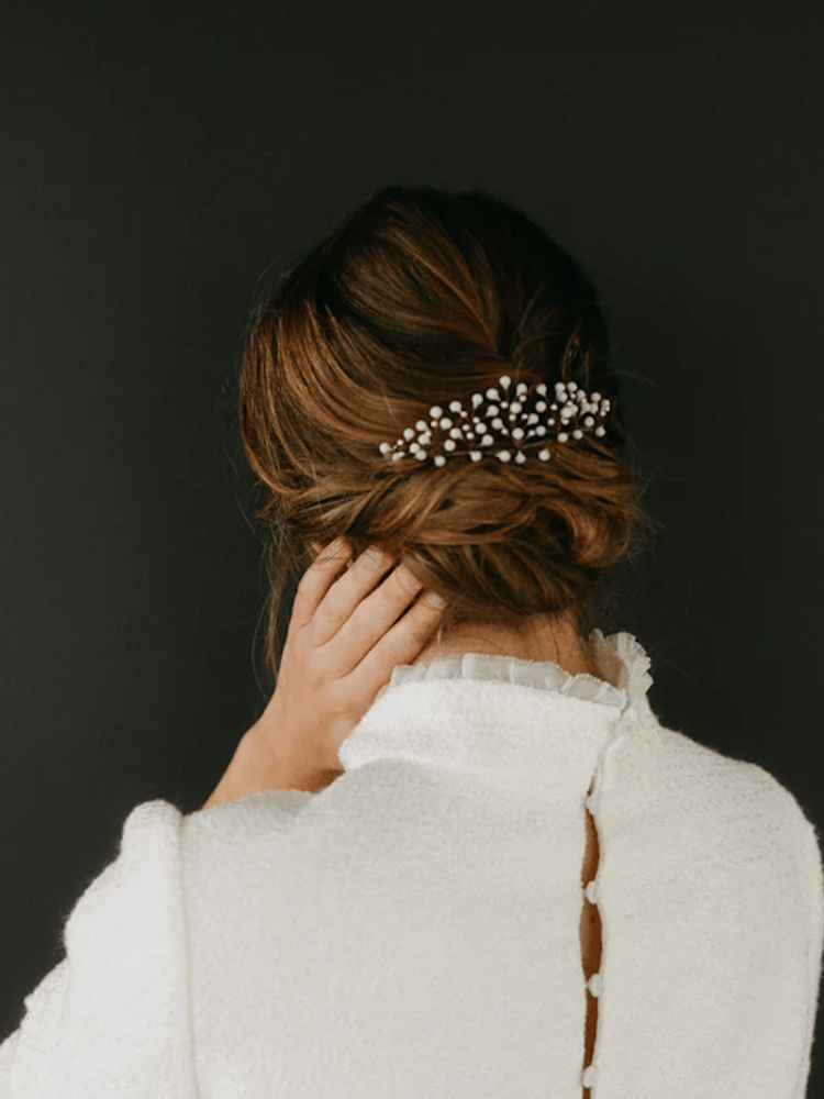 El peine para el cabello Abel de Lizeron es una pieza delicada y hecha a mano, diseñada para lucir elegantemente en un peinado recogido. Fabricado con elementos de porcelana fina en acabados mates y perlados, refleja la luz de manera hermosa. Se asegura fácilmente con horquillas y es ligero y cómodo. ¡Es un accesorio atemporal para un look elegante y refinado!