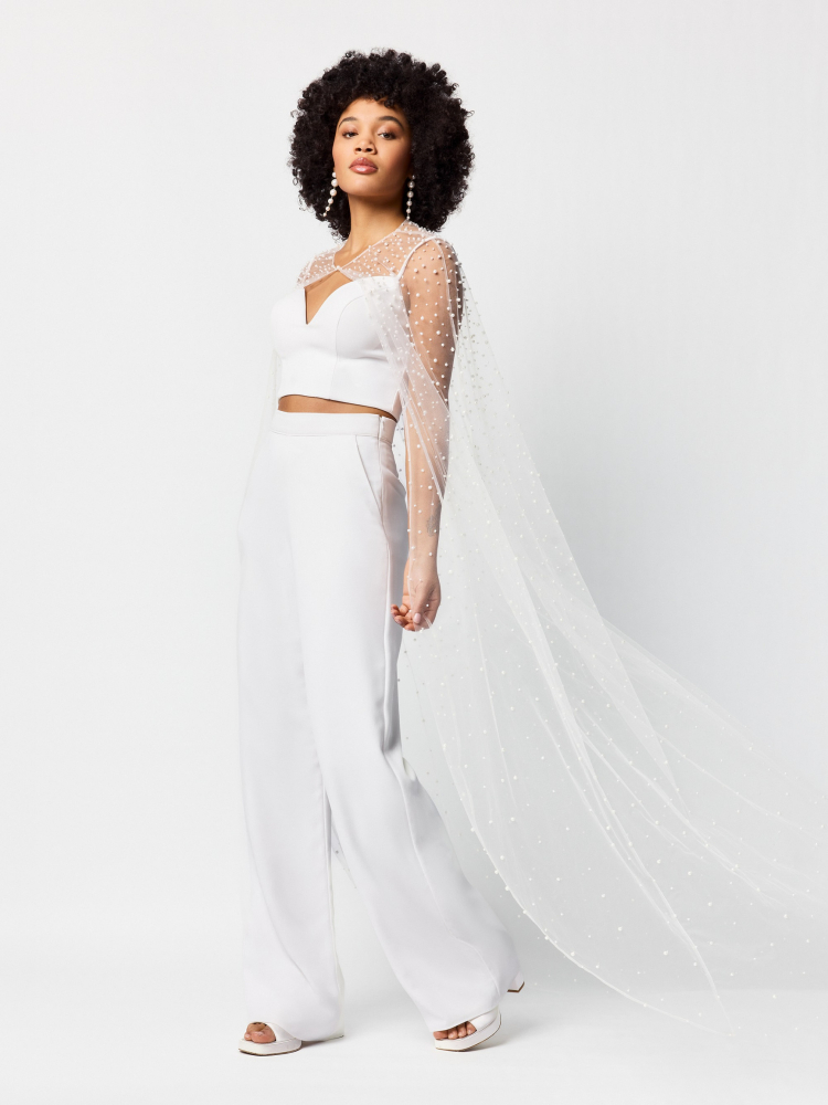 La capa Poirier C-75100 es una capa de tul marfil de 200 cm de largo, adornada con perlas y terminada con un cierre de botón de perla. Una alternativa elegante y moderna al velo. Perfecta para quienes buscan un toque sofisticado y contemporáneo en su look nupcial.