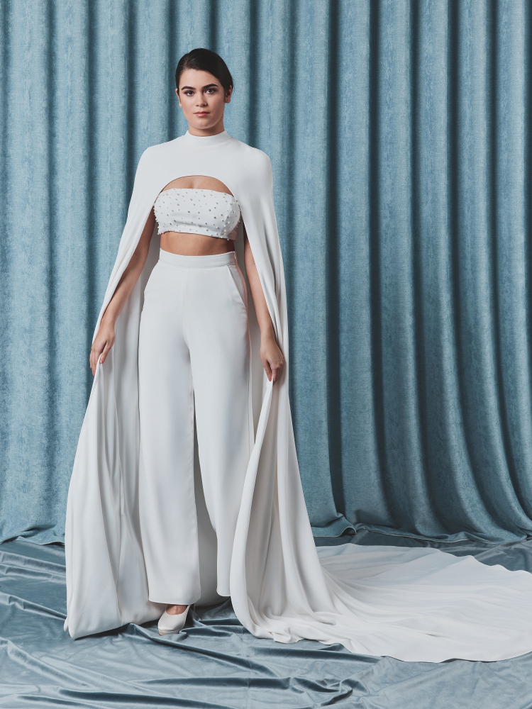 La Capa Poirier C-75105 se cierra de manera discreta con un cierre de cremallera en la parte posterior, permitiendo un acabado impecable mientras realza la estructura arquitectónica de la prenda. Ideal para novias modernas que desean un look regio y minimalista, esta capa transforma cualquier atuendo nupcial en un conjunto digno de pasarela. Ya sea combinada con un vestido ajustado o separadores nupciales contemporáneos, añade sofisticación, movimiento y una sensación de gracia empoderada.