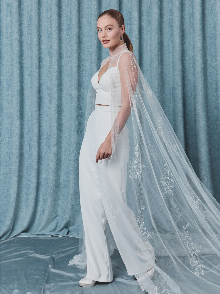 El cuello alzado enmarca el escote con una estructura sutil y se cierra al frente con un refinado botón de cristal, asegurando tanto elegancia como comodidad. La Capa Poirier C-75107 es el toque final perfecto para novias que buscan una sofisticación atemporal con un giro moderno inspirado en la alta costura. Ideal para ceremonias o retratos nupciales, esta capa transforma cualquier vestido o atuendo en un look verdaderamente inolvidable.