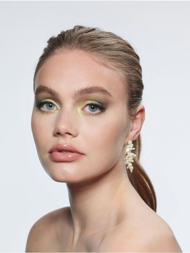 Pendientes de la colección de tendencia Poirier. Los pendientes tienen una base de color dorado con perlas de agua dulce de color marfil y perlas redondas.