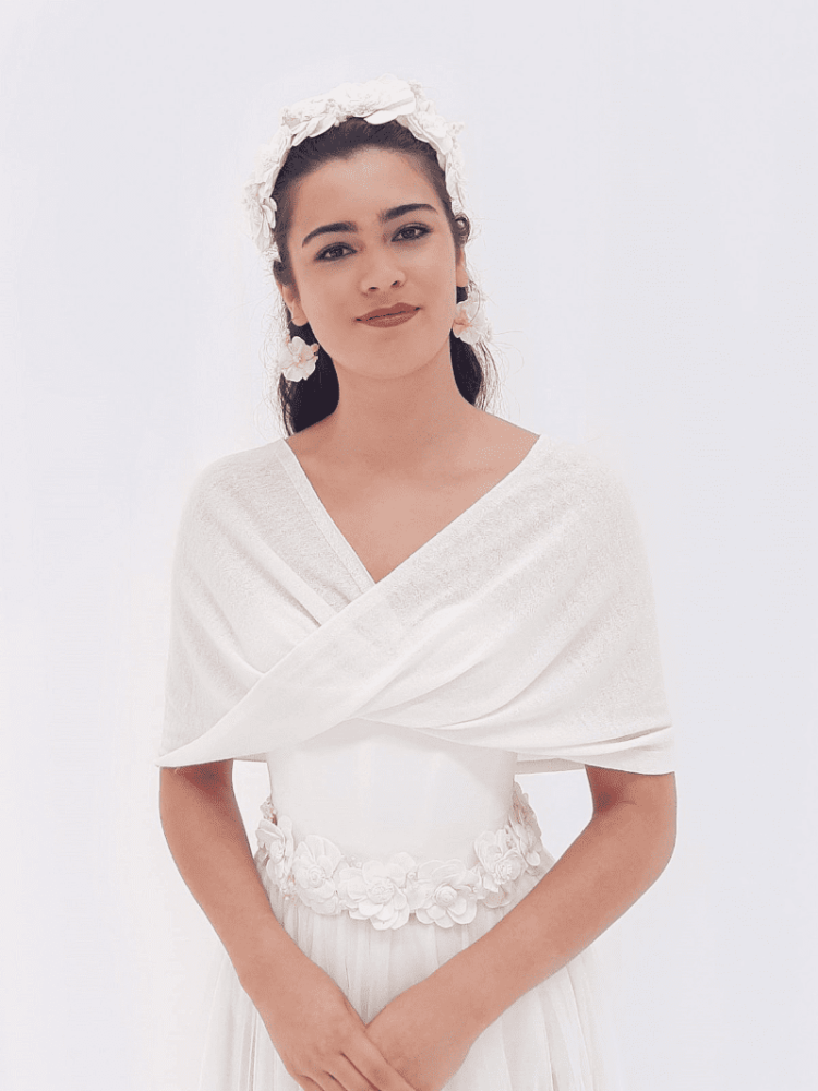 Elija el modelo de tubo S187 de color marfil y suave caída de la colección Romantic de Poirier. Esta estola está trenzada en el centro delantero. La estola está confeccionada en un tejido mixto (16% lana, 20% acrílico, 20% nailon y 44% poliéster). La estola es de un color marfil neutro, por lo que puede combinarse con diversos vestidos de novia. Esta preciosa estola es el toque final perfecto para su traje de novia. La talla de esta estola es "talla única".