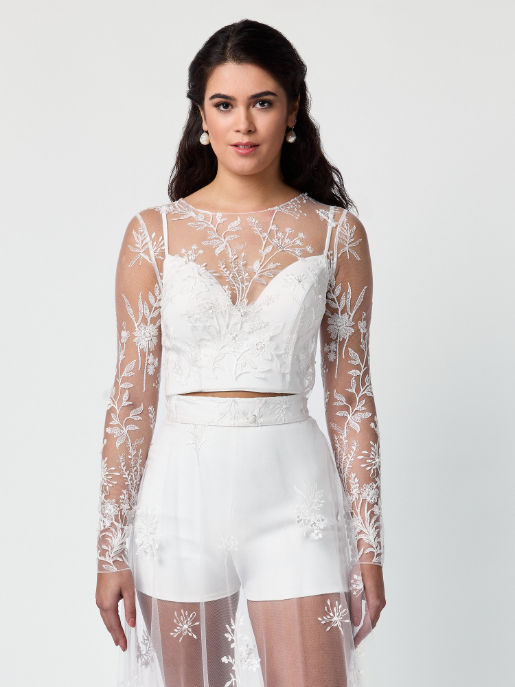 La parte superior Poirier T-75417 cuenta con largas mangas de tul marfil bordado, adornadas con lentejuelas y perlas. Con un romántico diseño floral y un clásico cierre de botones en la espalda, combina perfectamente con artículos de la línea Uma. Ideal para añadir un suave y elegante encanto a tu atuendo nupcial.