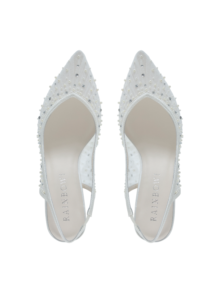 Los Rainbow Club Lucia Slingback unen brillo romántico y ligereza. En delicado tul marfil con cristales centelleantes, con punta, diseño destalonado y un tacón ancho de 7 cm que sujeta de verdad.
