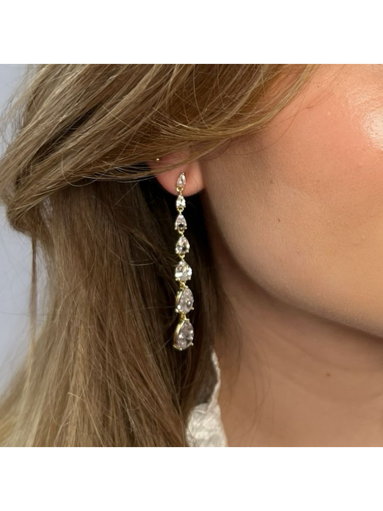 La elegancia moderna se une al brillo eterno en los pendientes Ella Gold de Sally Jane Bridal. Con circonias en cascada y acabado dorado radiante, estos pendientes largos aportan un brillo sutil con cada movimiento, perfectos para completar looks nupciales clásicos y contemporáneos.