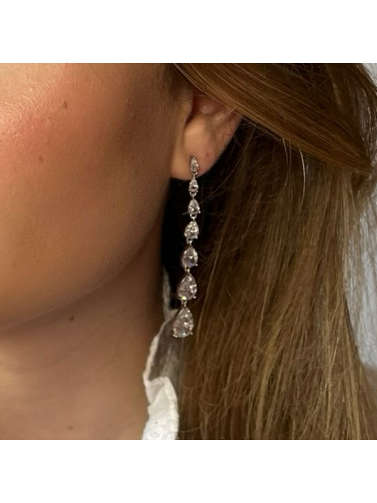 El glamour moderno se encuentra con el encanto vintage en los pendientes Ella de Sally Jane Bridal. Con zirconias en cascada y un diseño en lágrima, destellan con cada movimiento y se convierten en el remate perfecto para tu look nupcial o de celebración.