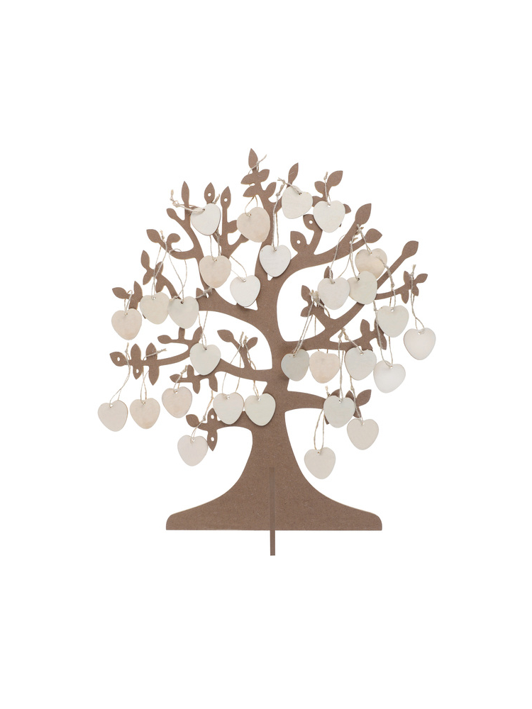 Este fantástico árbol de deseos de madera de Santex incluye 50 corazones y es ideal para que sus invitados escriban un pequeño mensaje o una hermosa cita.
